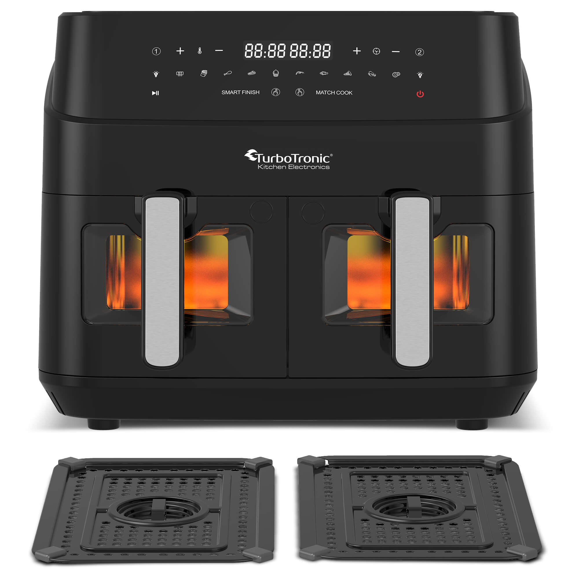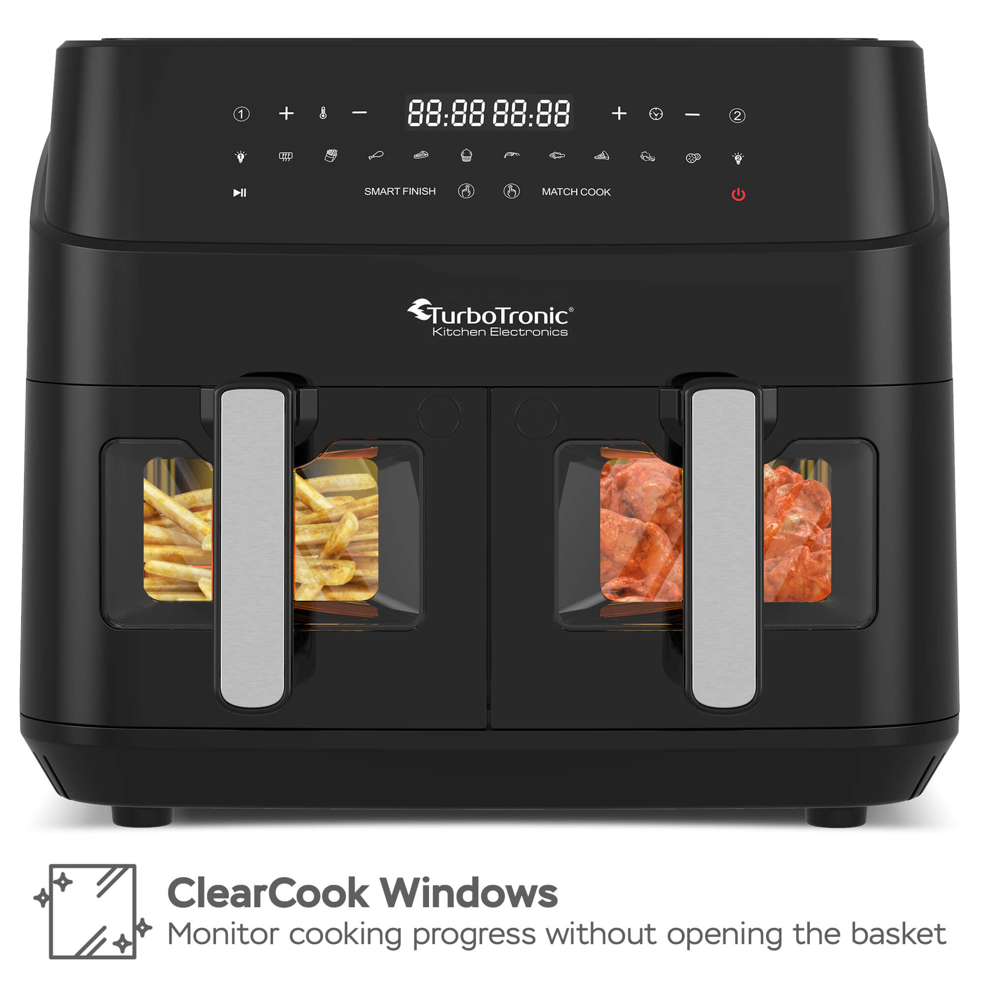 Enjoy easy home cooking with the “dual chef” Professional Digital Double Basket with Windows Air Fryer by TurboTronic®.