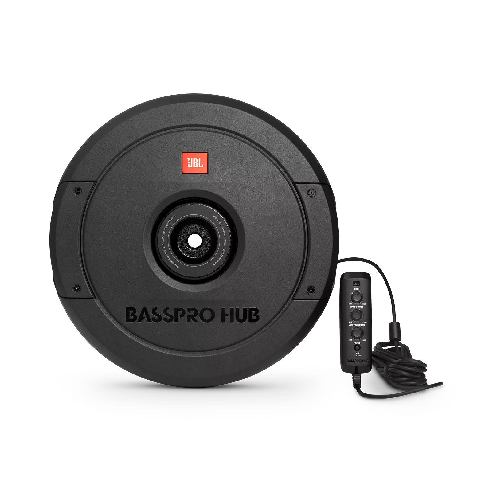 The new JBL BassPro Hub subwoofer delivers show & shine performance without crowding your passengers or sacrificing cargo area. This all-in-one powered subwoofer system fits into the hub of your spare tire for a super easy installation and out of sight sound solution. The built-in Class D amp delivers 200W RMS and is designed to work with the BassPro Hub subwoofer and enclosure as a system. The 11″ (279mm) feather-light fiberglass woofer cone with rubber surround delivers the signature kick and punch of JBL bass. And with over temperature protection (OTP) and over current protection (OCP) you can count on reliability at peak volume levels. The included remote control enables adjustment of crossover point, gain, phase—and a bass boost of 12dB when you’re in the mood and on the move. Whether you’re cruising or competing, the JBL BassPro leaves the competition behind without missing a beat.