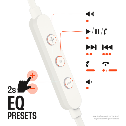 Introducing JBL Tune 310C USB-C in-ear headphones. They’re lightweight, comfortable and compact. A pair of 9mm dynamic drivers punch out powerful JBL Pure Bass Sound, while the High-Resolution Audio support ensures great sound quality. A USB-C connection makes them compatible with a large variety of devices like PCs, mobiles, and gaming devices. In addition, the three-button remote on a tangle-free flat cable lets you control music playback and volume adjustment, EQ presets, as well as answering calls on the fly with a built-in microphone. All this makes the JBL Tune 310C USB-C your everyday companion, at work, at home, and on the road.